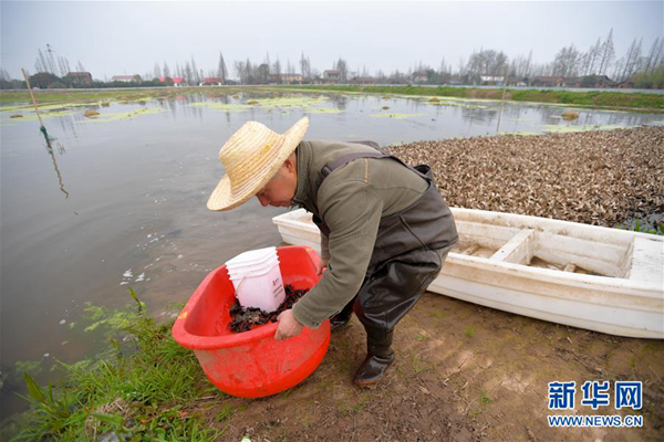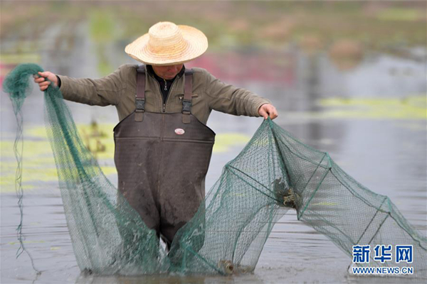 在湖南省南縣一處稻蝦蟹綜合種養(yǎng)基地,農(nóng)戶在捕收蝦蟹(3月13日攝)。新華社發(fā)(陳澤國(guó) 攝)