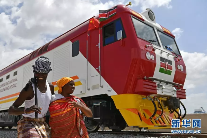 2017年1月11日,在肯尼亞蒙巴薩,當(dāng)?shù)孛癖娫谥袊?guó)承制的蒙內(nèi)鐵路首批內(nèi)燃機(jī)車旁載歌載舞。新華社記者孫瑞博攝