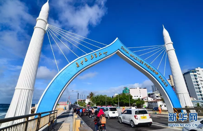2018年10月2日,車輛從由中國(guó)援建、連接馬爾代夫首都馬累和機(jī)場(chǎng)島的中馬友誼大橋橋頭拱門穿過(guò)。新華社發(fā)(杜才良 攝)