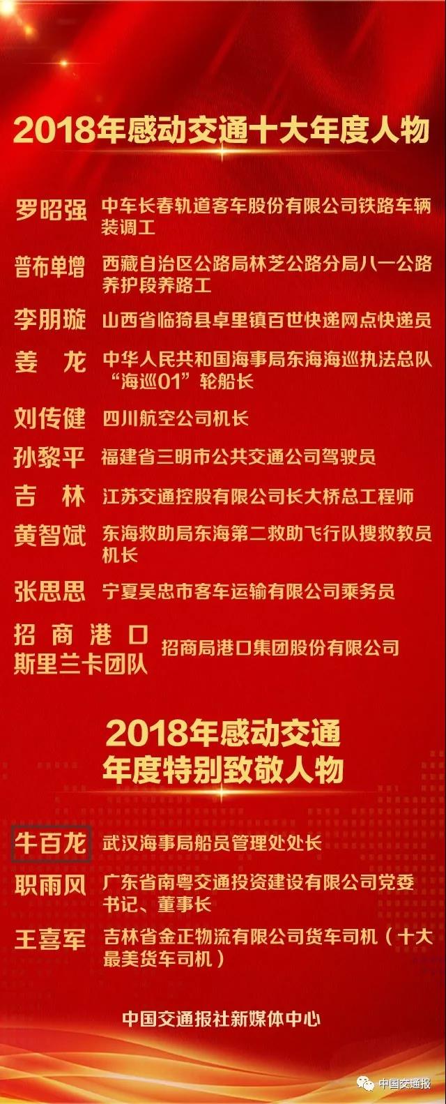 另外,將青春和生命奉獻(xiàn)給海事交通事業(yè)的武漢海事局船員管理處處長(zhǎng)牛百龍;胸懷大愛(ài),積極踐行“大道為公”理念的廣東南粵交通投資建設(shè)有限公司黨委書(shū)記、董事長(zhǎng)職雨風(fēng);400萬(wàn)公里安全駕駛、細(xì)心工作、熱心助人的吉林省物流貨車司機(jī)王喜軍榮獲“2018年感動(dòng)交通年度特別致敬人物”稱號(hào)。