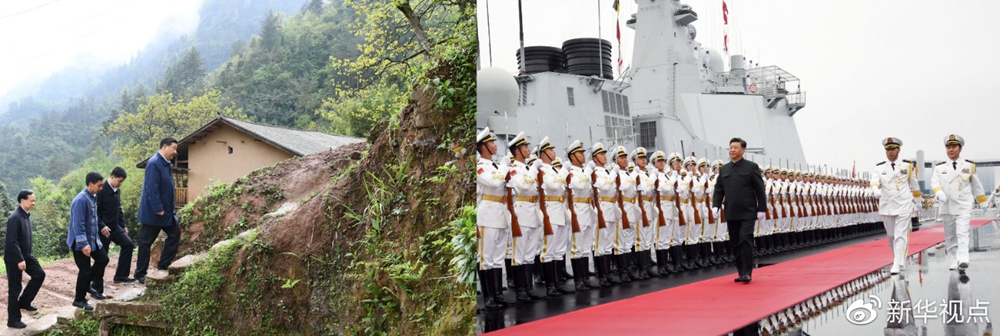 左圖為4月15日下午,在重慶石柱土家族自治縣中益鄉(xiāng)華溪村,習近平踏著濕滑的石階登上陡坡,前往貧困戶譚登周家看望(謝環(huán)馳攝);右圖為4月23日,習近平出席慶祝人民海軍成立70周年海上閱兵活動(李剛攝)