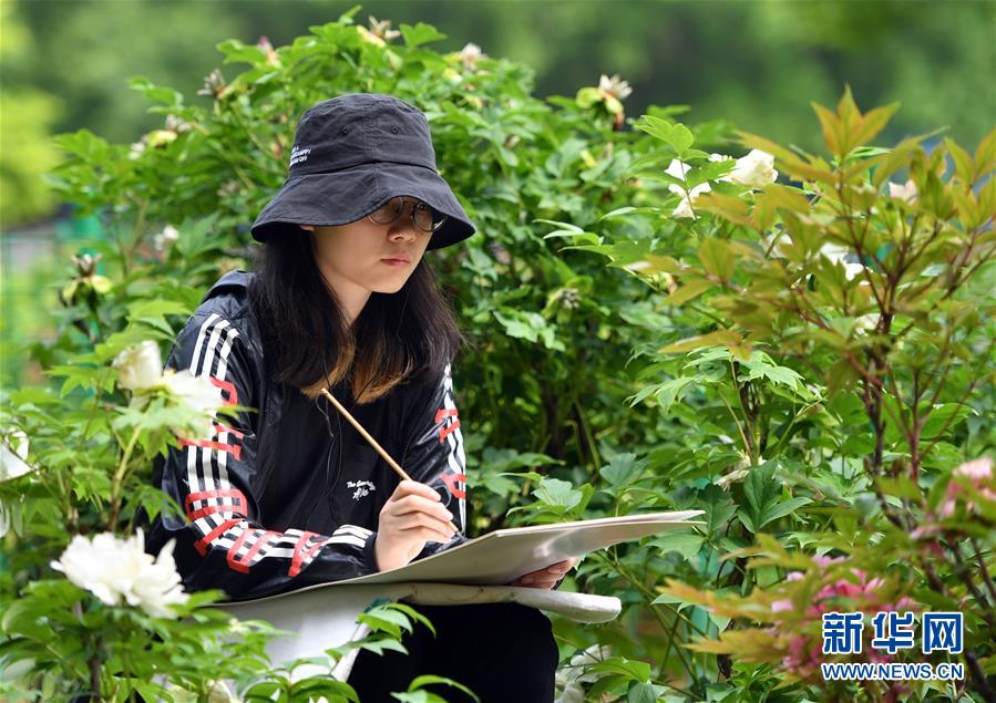 寫生愛(ài)好者在洛陽(yáng)國(guó)家牡丹園內(nèi)寫生(4月24日攝)。新華社記者 李嘉南 攝