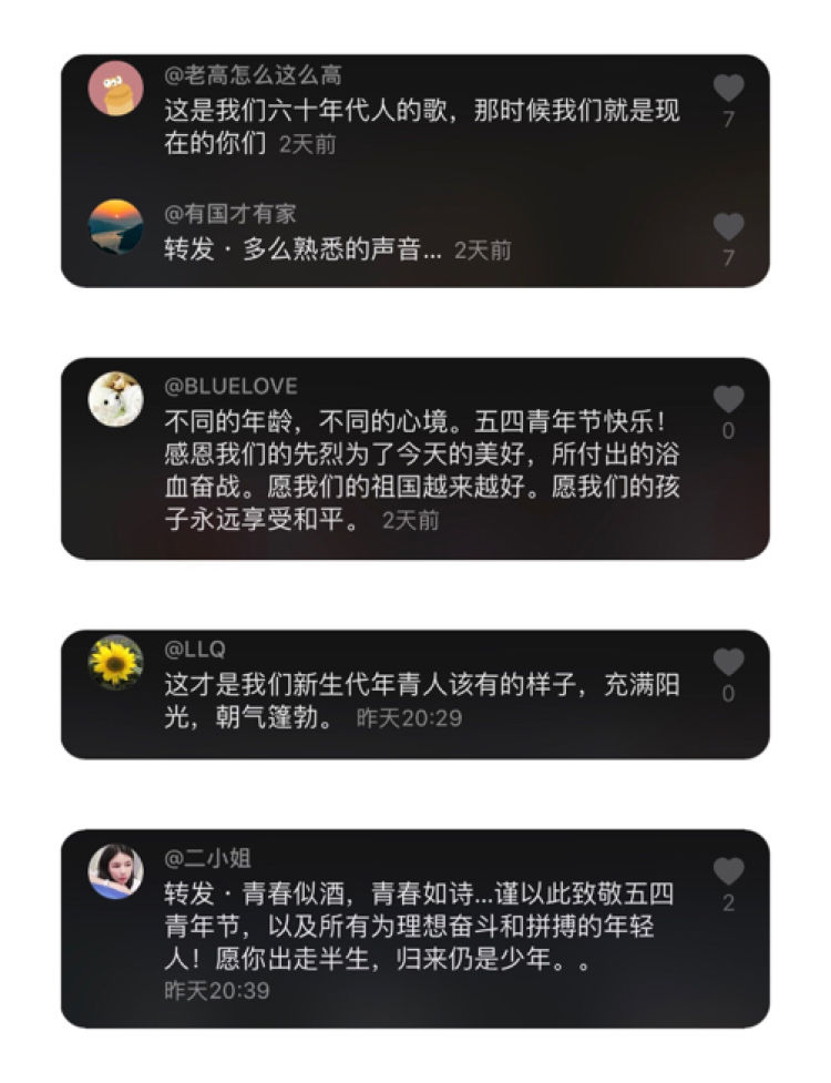 一首首歌喚起了不同年代人們的青春記憶,也展現(xiàn)了新時代青年的青春活力。清華大學、上海交通大學、蘭州大學、復旦大學、中央民族大學、北京電影學院、安徽大學等數(shù)十所知名高校參加,中國科學技術(shù)大學附屬中學、北京101中學等一批小童鞋也不甘示弱,國家電網(wǎng)、上海鐵路局甚等單位駐海外青年人也紛紛發(fā)來視頻。