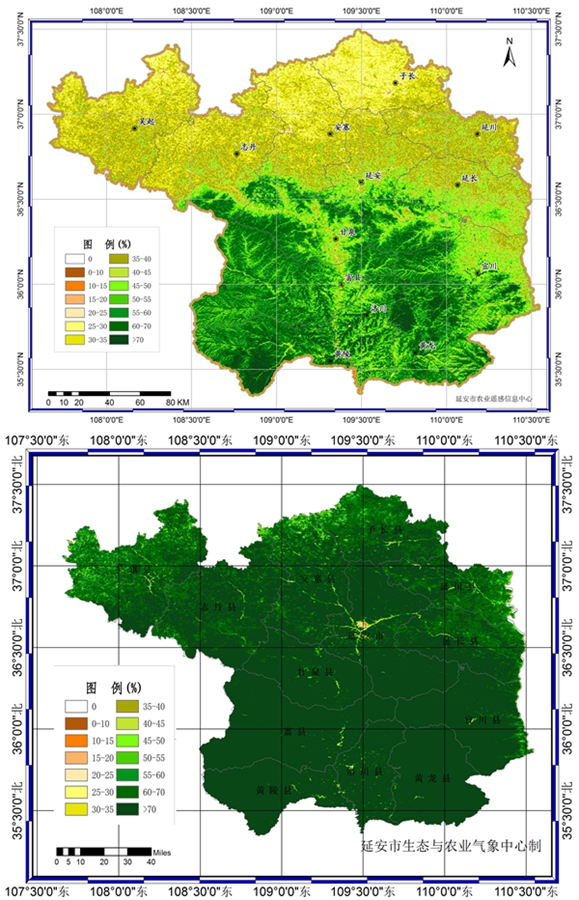 這是一張拼版照片:上圖為2000年延安市遙感植被覆蓋度圖;下圖為2018年延安市遙感植被覆蓋度圖。 新華社記者 劉瀟 攝