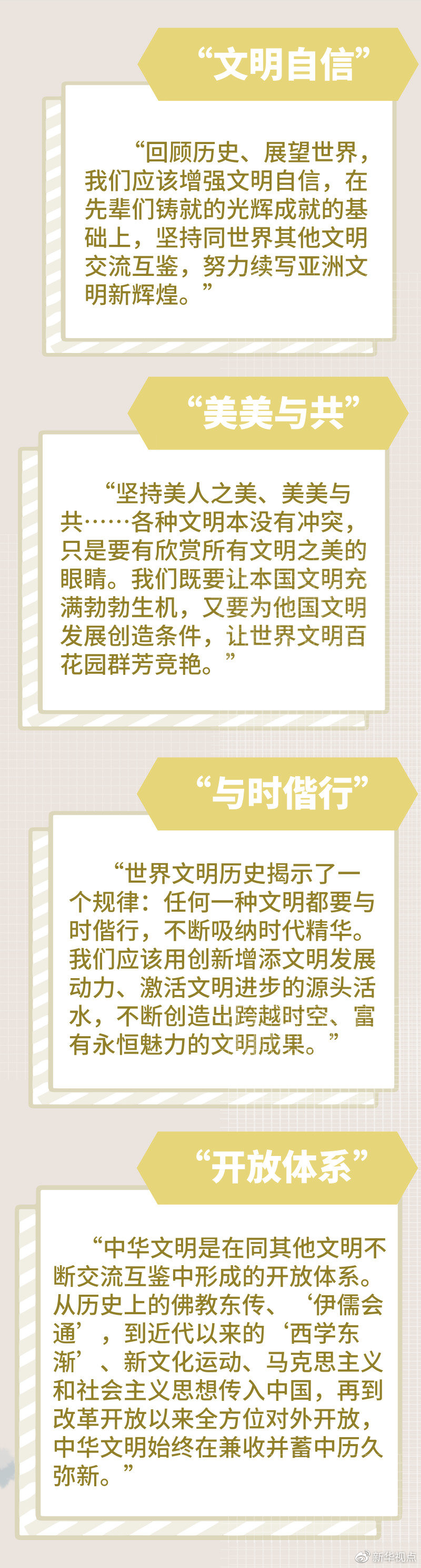 總結(jié)亞洲輝煌的文明成果,闡釋中華文明深刻內(nèi)涵,介紹不同文明“相處之道”,并提出亞洲人民三個期待和加強(qiáng)世界上不同國家、不同民族、不同文化交流互鑒的四點主張……