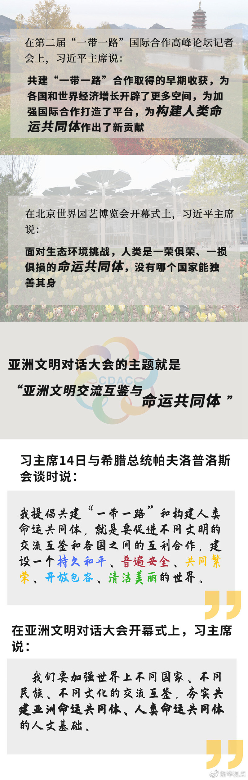 半個多月來,世界的目光一次次聚焦北京。從第二屆“一帶一路”國際合作高峰論壇,到2019年中國北京世界園藝博覽會,再到亞洲文明對話大會,三場活動主題不同,卻有一個關(guān)鍵詞貫穿始終:命運(yùn)共同體。