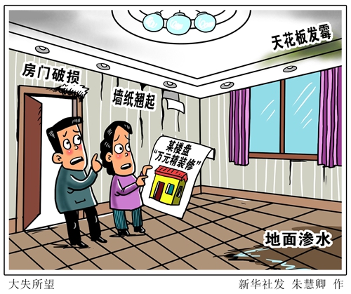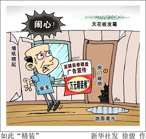 “新華視點”記者調(diào)查發(fā)現(xiàn),事實上所謂“萬元精裝修”的實際標(biāo)準(zhǔn)僅為幾百元,“名牌產(chǎn)品”實為不知名小工廠生產(chǎn)的。部分開發(fā)商一味追求壓縮成本,導(dǎo)致裝修質(zhì)量問題頻發(fā)。近日,住建部辦公廳發(fā)布通知,在全國范圍內(nèi)開展建筑市場和工程質(zhì)量安全監(jiān)督執(zhí)法檢查。