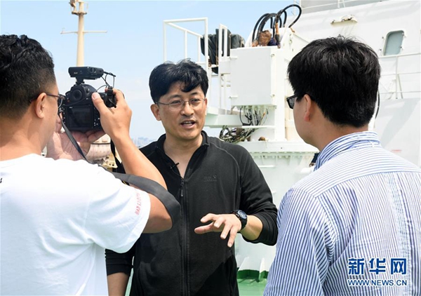 5月18日,航次首席科學(xué)家、中國(guó)科學(xué)院海洋研究所研究員徐奎棟(中)在接受采訪。新華社記者 李紫恒 攝