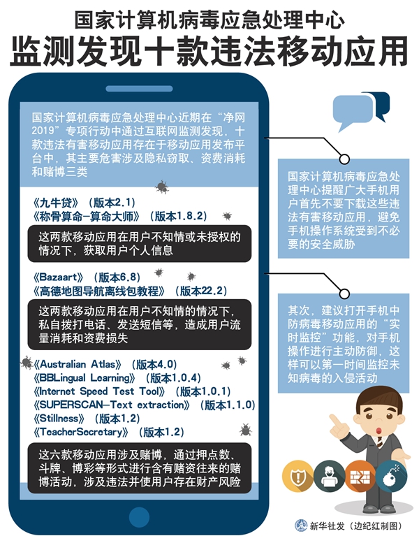 新華社天津5月28日電(記者張建新)國家計算機病毒應(yīng)急處理中心近期在“凈網(wǎng)2019”專項行動中通過互聯(lián)網(wǎng)監(jiān)測發(fā)現(xiàn),十款違法有害移動應(yīng)用存在于移動應(yīng)用發(fā)布平臺中,其主要危害涉及隱私竊取、資費消耗和賭博三類。