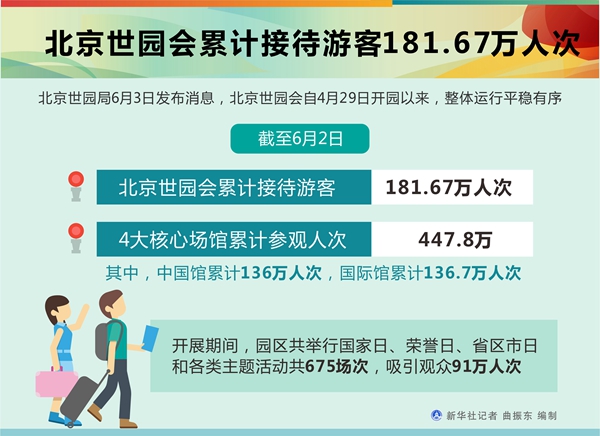 新華社北京6月3日電(記者魏夢(mèng)佳、丁靜)北京世園局3日發(fā)布消息,北京世園會(huì)自4月29日開(kāi)園以來(lái),整體運(yùn)行平穩(wěn)有序。截至6月2日,北京世園會(huì)累計(jì)接待游客181.67萬(wàn)人次,4大核心場(chǎng)館累計(jì)參觀人次達(dá)447.8萬(wàn)。