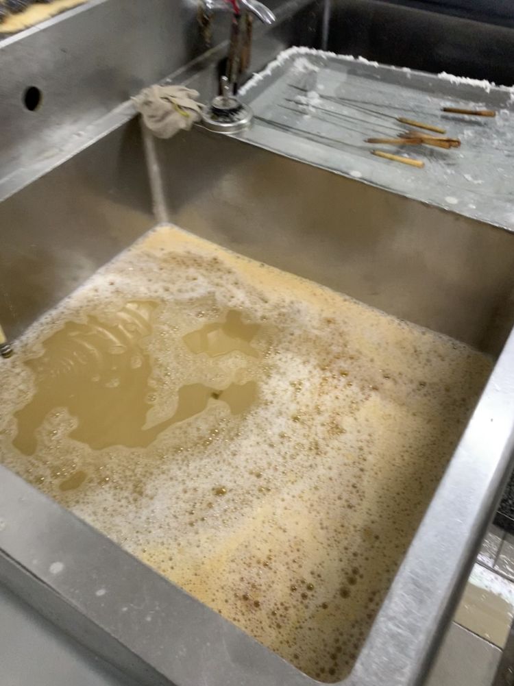 一樓洗碗間,已經(jīng)被油污污染發(fā)黃的洗潔精水池。圖片來(lái)源:新華社客戶(hù)端
