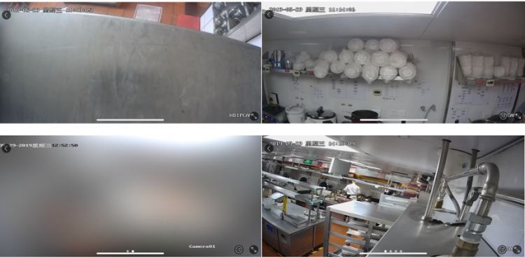 5月29日,“海淀陽(yáng)光餐飲”APP上,味千拉面(SOGO本館店)、西少爺(復(fù)興門店)、成都小吃(西便門內(nèi)大街)、那家小館百盛店,均存在攝像頭被遮擋、角度對(duì)不準(zhǔn)或拍不到廚師工作的現(xiàn)象。圖片來(lái)源:新華社客戶端