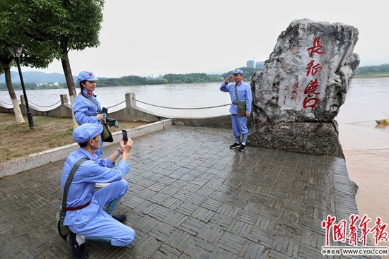 6月12日,中央紅軍長征第一渡紀(jì)念碑園,游客在長征渡口碑前拍照。 中國青年報(bào)·中青在線記者 李建泉/攝