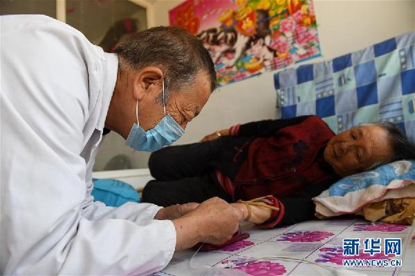 6月7日,在哈彥陶勒蓋自然村,韓四虎準(zhǔn)備為76歲的榮花桃輸液。新華社記者 劉磊 攝