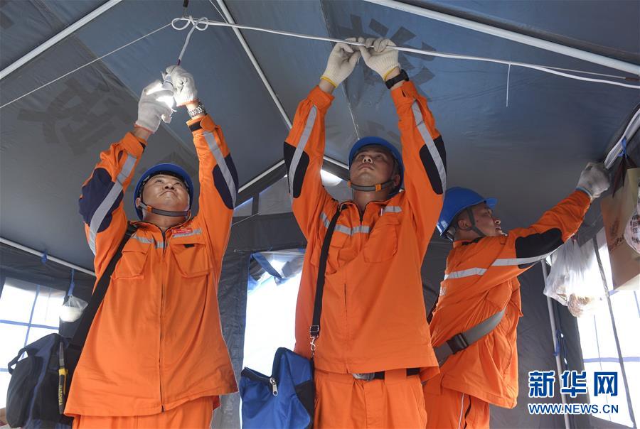 6月20日,國網(wǎng)成都供電公司連心橋共產(chǎn)黨員服務(wù)隊(duì)抗震救災(zāi)臨時(shí)黨支部成員在安置點(diǎn)帳篷內(nèi)架設(shè)電線、安裝電燈。新華社記者 劉坤 攝
