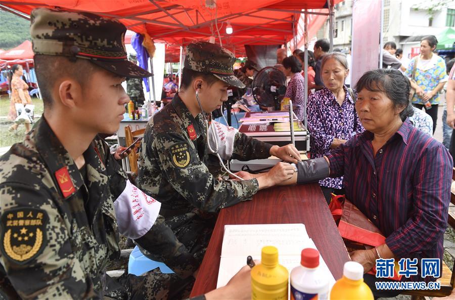 6月20日,武警宜賓支隊(duì)衛(wèi)生隊(duì)黨小組成員在安置點(diǎn)為群眾提供醫(yī)療服務(wù)。新華社記者 劉坤 攝