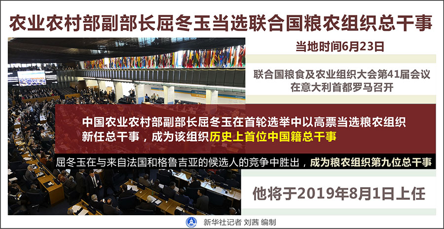 新華社羅馬6月23日電(記者陳占杰)聯(lián)合國糧食及農業(yè)組織大會第41屆會議23日在意大利首都羅馬召開,中國農業(yè)農村部副部長屈冬玉在首輪選舉中以高票當選糧農組織新任總干事,成為該組織歷史上首位中國籍總干事。