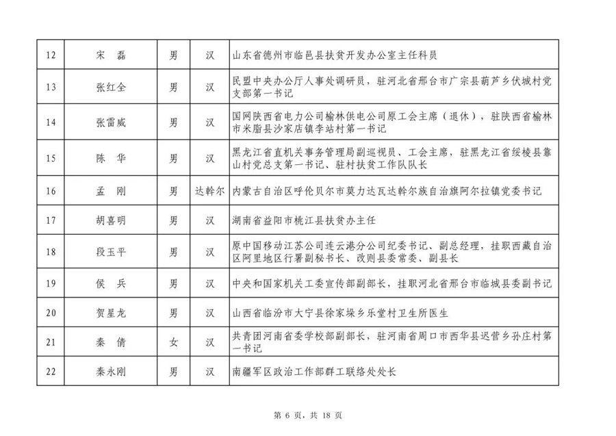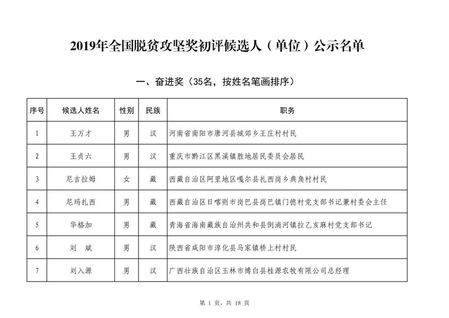 根據(jù)國務(wù)院扶貧開發(fā)領(lǐng)導(dǎo)小組印發(fā)的《2019年全國脫貧攻堅(jiān)獎(jiǎng)評(píng)選表彰工作方案》,經(jīng)全國脫貧攻堅(jiān)獎(jiǎng)評(píng)選委員會(huì)初次評(píng)審,以下140名人選和59個(gè)單位作為2019年全國脫貧攻堅(jiān)獎(jiǎng)初評(píng)候選人(單位),現(xiàn)予以公示。