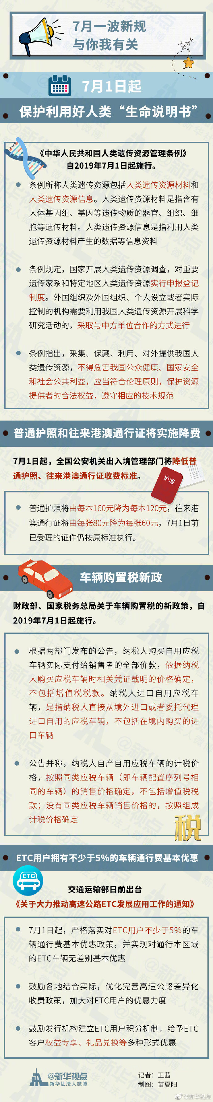 保護(hù)利用好人類“生命說明書”;普通護(hù)照和往來港澳通行證將實(shí)施降費(fèi);車輛購置稅新政7月1日起施行;ETC用戶擁有不少于5%的車輛通行費(fèi)基本優(yōu)惠……7月1日起,一批與你我有關(guān)的新規(guī)將正式施行。戳圖帶你了解干貨??,轉(zhuǎn)發(fā)周知! ????