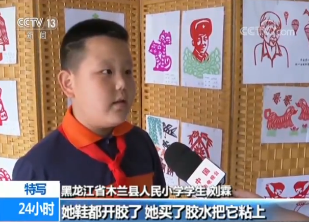 黑龍江省木蘭縣人民小學(xué) 學(xué)生 劉霖:她鞋都開(kāi)膠了,她買(mǎi)了膠水粘上,感覺(jué)她很節(jié)約很偉大,很尊敬馬奶奶,我和我的同學(xué)包括我的老師,也一起以馬奶奶為主題剪了一些剪紙作品,這個(gè)就是馬奶奶自畫(huà)像。