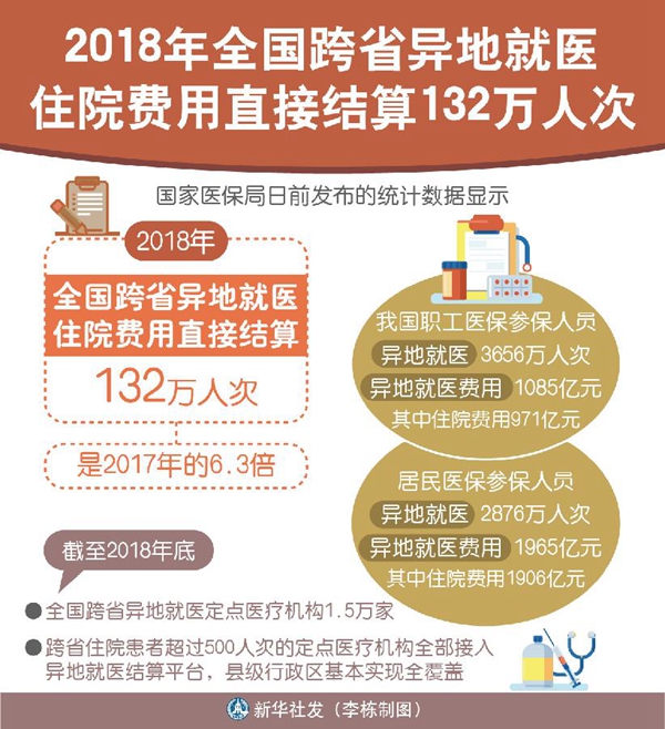 截至2018年底,全國(guó)跨省異地就醫(yī)定點(diǎn)醫(yī)療機(jī)構(gòu)1.5萬(wàn)家,跨省住院患者超過(guò)500人次的定點(diǎn)醫(yī)療機(jī)構(gòu)全部接入異地就醫(yī)結(jié)算平臺(tái),縣級(jí)行政區(qū)基本實(shí)現(xiàn)全覆蓋。