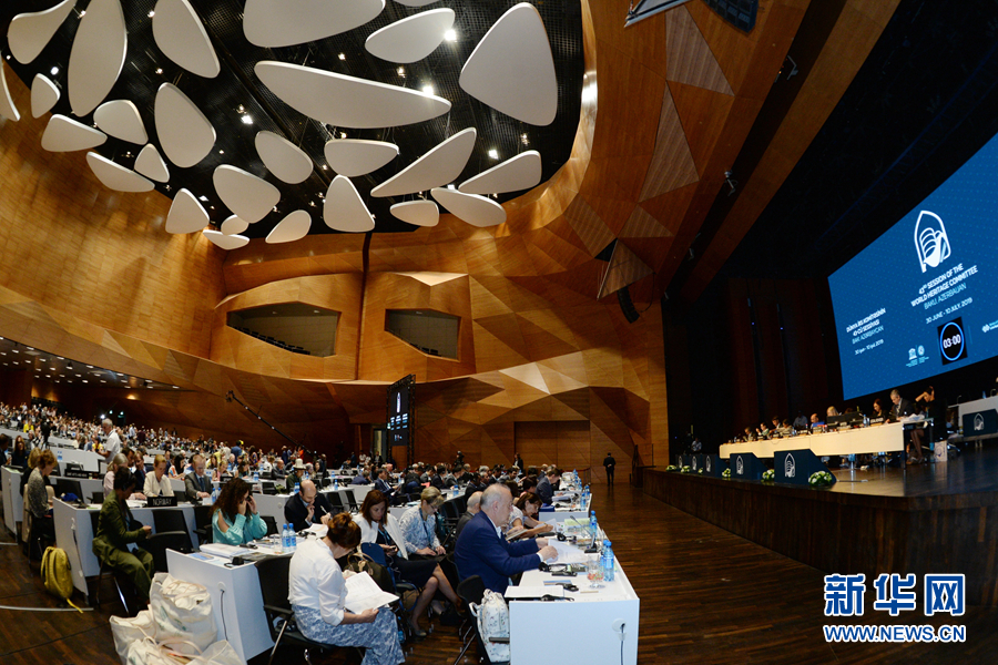 這是7月5日在阿塞拜疆巴庫拍攝的世界遺產(chǎn)大會現(xiàn)場。 新華社發(fā)(巴巴耶夫 攝)