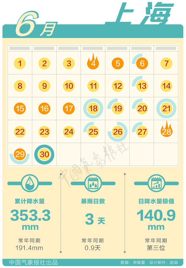但是上海降雨可不小,累計(jì)降雨量達(dá)353.3毫米,比常年同期191.4毫米多83%。6月30日上海中心城區(qū)(徐家匯站)日降水量達(dá)140.9毫米,是1874年有記錄以來6月日最大雨量的歷史第三位,為近20年出現(xiàn)的最大暴雨。