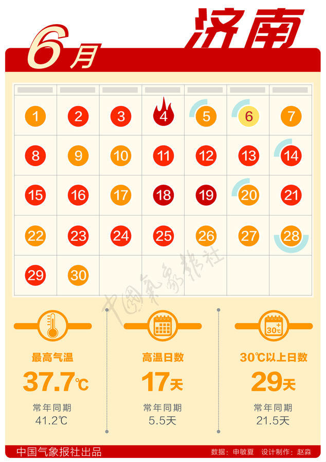 濟(jì)南:6月,濟(jì)南市區(qū)共出現(xiàn)17個高溫日,位列歷史同期第二位,第一位是1955年22個高溫日。最高氣溫37.7℃,與有記錄以來濟(jì)南市區(qū)6月最高氣溫41.2(2009年6月25日)還差一點(diǎn)。6月35℃以上高溫日數(shù)也未突破歷史極值,但30天中有29天都是30℃以上。