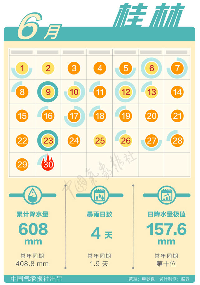 桂林:6月累計(jì)雨量大達(dá)608毫米,而且暴雨日數(shù)多,同時極端性很強(qiáng)。6月6日83.7毫米的日降水量、6月9日157.6毫米的日降水量、6月12日76.2毫米的日降水量,均打破同期歷史記錄極值。6月23日101.5毫米日降水量位居歷史第二。