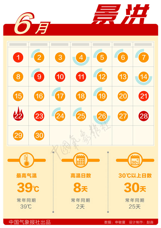 景洪:云南景洪高溫日數(shù)為8天,為歷史同期最多,比常年同期偏多6天;6月逐日最高氣溫均超過30℃,為歷史同期最多;6月極端最高氣溫39℃,追平了6月最高氣溫記錄。而且降水稀少:6月降水量65.6毫米,僅次于1961年和2012年為歷史同期第三少年;6月無降水日數(shù)17天,為1961年以來同期最少。