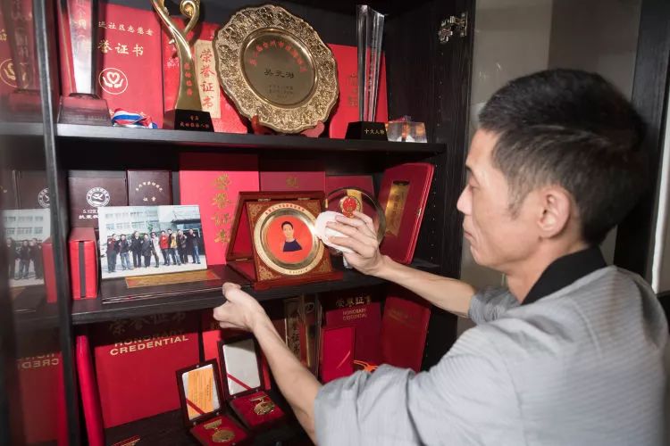 吳元渺在擦拭自己的全國五一勞動獎?wù)?。柜子里擺放的都是他獲得的各種榮譽(yù)證書和獎?wù)隆?/font>