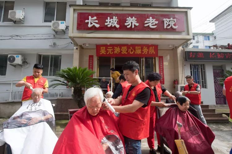 吳元渺愛心服務(wù)隊(duì)的志愿者們在臨海市一家養(yǎng)老院為老人義務(wù)理發(fā)。
