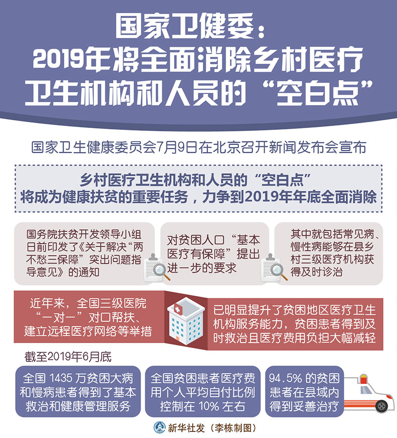 新華社北京7月9日電(記者屈婷、王秉陽(yáng))少數(shù)地區(qū)仍有衛(wèi)生室“空白村”,“三區(qū)三州”深度貧困地區(qū)有的鄉(xiāng)鎮(zhèn)缺少全科醫(yī)生……國(guó)家衛(wèi)生健康委員會(huì)9日在京召開新聞發(fā)布會(huì)宣布,像上述這些鄉(xiāng)村醫(yī)療衛(wèi)生機(jī)構(gòu)和人員的“空白點(diǎn)”,將成為健康扶貧的重要任務(wù),力爭(zhēng)到今年年底全面消除。