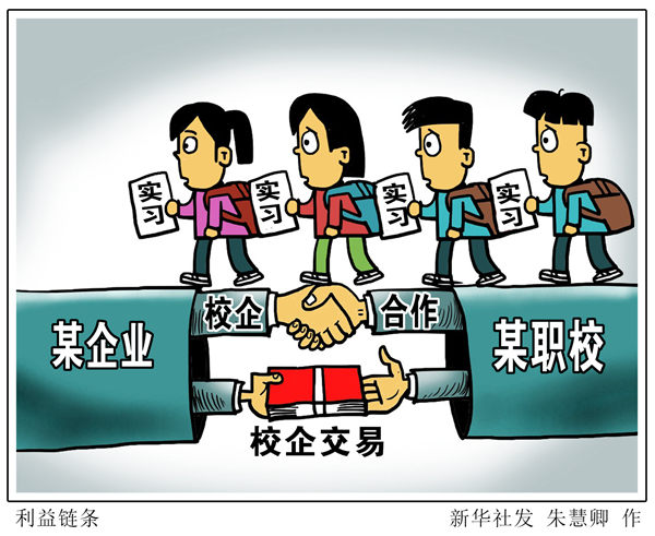 業(yè)內(nèi)人士認(rèn)為,一些職業(yè)學(xué)校將學(xué)生隨意送到一些與專業(yè)無(wú)關(guān)的企業(yè)實(shí)習(xí),甚至以此牟利,這背離了職業(yè)教育的初衷。教育、人社等主管部門應(yīng)加大對(duì)職校實(shí)習(xí)的監(jiān)管力度,斬?cái)嗦毿?shí)習(xí)背后的利益鏈條,防止“校企合作”成為“校企交易”。