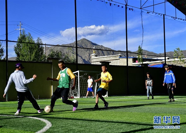 孩子們在山南市澤當鎮(zhèn)贊堂社區(qū)操場踢足球(7月31日攝)。新華社記者 張汝鋒 攝