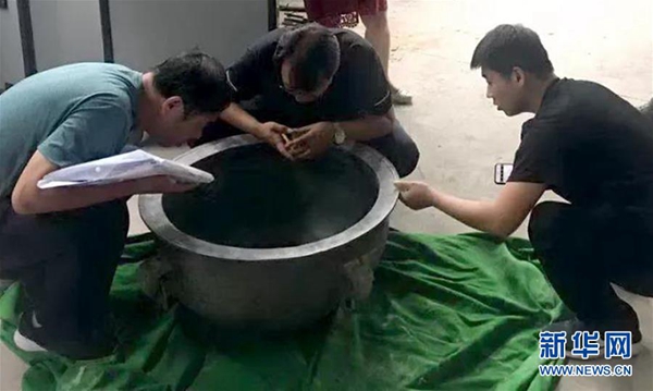 警方在蘭州市西固區(qū)河口鎮(zhèn)一倉庫內(nèi)截獲文物“鑒盆”(8月8日攝)。新華社發(fā) (蘭州市公安局新聞辦 供圖)