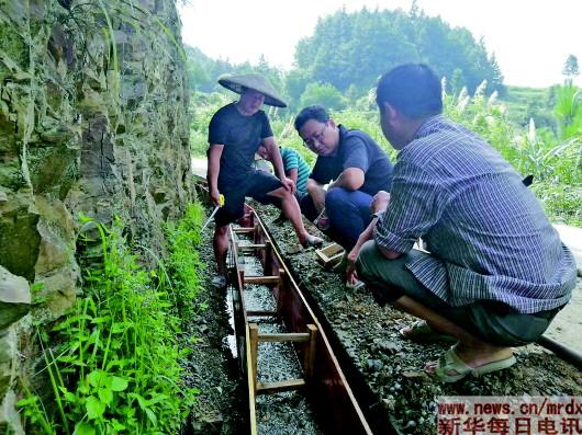 虎皮溪村扶貧工作隊員和村民一起查看水渠修建進展。 受訪者供圖