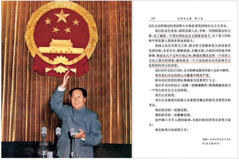 毛澤東同志在1954年第一屆全國人民代表大會第一次全體會議致開幕詞時(shí)宣布:準(zhǔn)備在幾個(gè)五年計(jì)劃之內(nèi),將我國“建設(shè)成為一個(gè)工業(yè)化的具有高度現(xiàn)代文化程度的偉大的國家”,強(qiáng)調(diào)“領(lǐng)導(dǎo)我們事業(yè)的核心力量是中國共產(chǎn)黨”。左圖為毛澤東同志在第一屆全國人大第一次會議上致開幕詞;右圖為毛澤東同志在開幕詞中的重要論述。