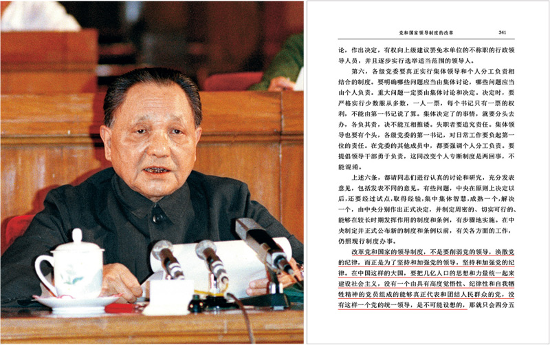 鄧小平同志高度重視堅(jiān)持和加強(qiáng)黨的領(lǐng)導(dǎo),旗幟鮮明地指出中國共產(chǎn)黨是社會主義現(xiàn)代化事業(yè)的領(lǐng)導(dǎo)核心,在改革開放和現(xiàn)代化建設(shè)中,必須始終堅(jiān)持黨的領(lǐng)導(dǎo),加強(qiáng)和改進(jìn)黨的建設(shè)。左圖為鄧小平同志在中國共產(chǎn)黨第十二次全國代表大會上致開幕詞(新華社記者 錢嗣杰/攝);右圖為鄧小平同志有關(guān)堅(jiān)持和加強(qiáng)黨的領(lǐng)導(dǎo)的重要論述。