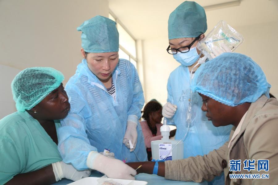 2014年12月10日,在塞拉利昂首都弗里敦,中國醫(yī)護人員在中塞友好醫(yī)院開展輸液培訓(xùn)活動。新華社發(fā)(戴欣 攝)