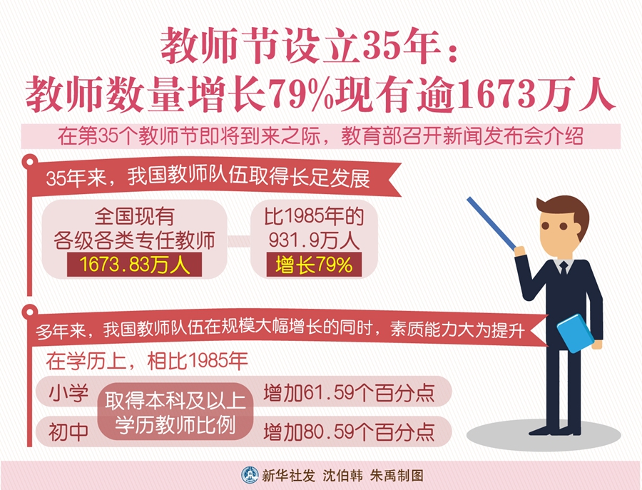 新華社北京9月3日電(記者 胡浩)在第35個教師節(jié)即將到來之際,教育部召開新聞發(fā)布會介紹,35年來,我國教師隊伍取得長足發(fā)展。全國現(xiàn)有各級各類專任教師1673.83萬人,比1985年的931.9萬人增長79%。