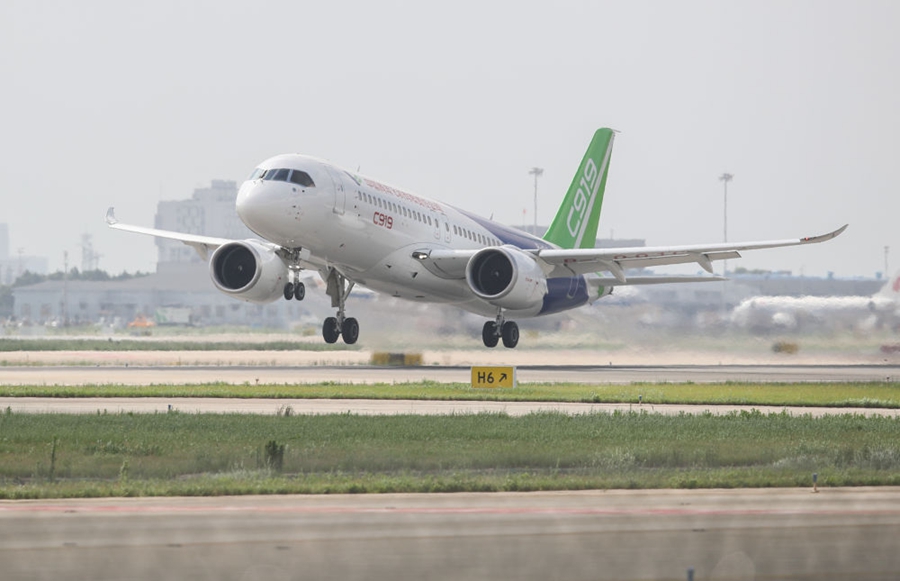 資料圖片:C919大型客機(jī)在上海浦東機(jī)場起飛。新華社記者 丁汀 攝