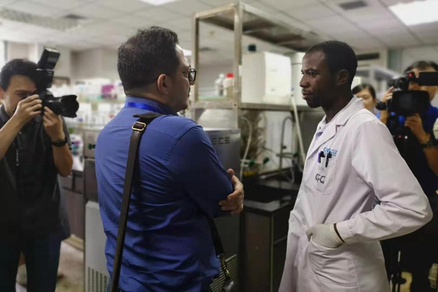來(lái)自喀麥隆的阿諾德(右一)在病原微生物與免疫學(xué)重點(diǎn)實(shí)驗(yàn)室從事博士后研究,他在向外國(guó)媒體記者介紹自己的工作。(王曉亮攝)