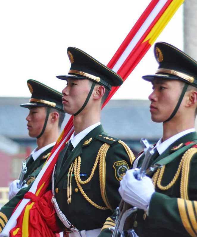 國旗護(hù)衛(wèi)隊在護(hù)送國旗走向升旗臺