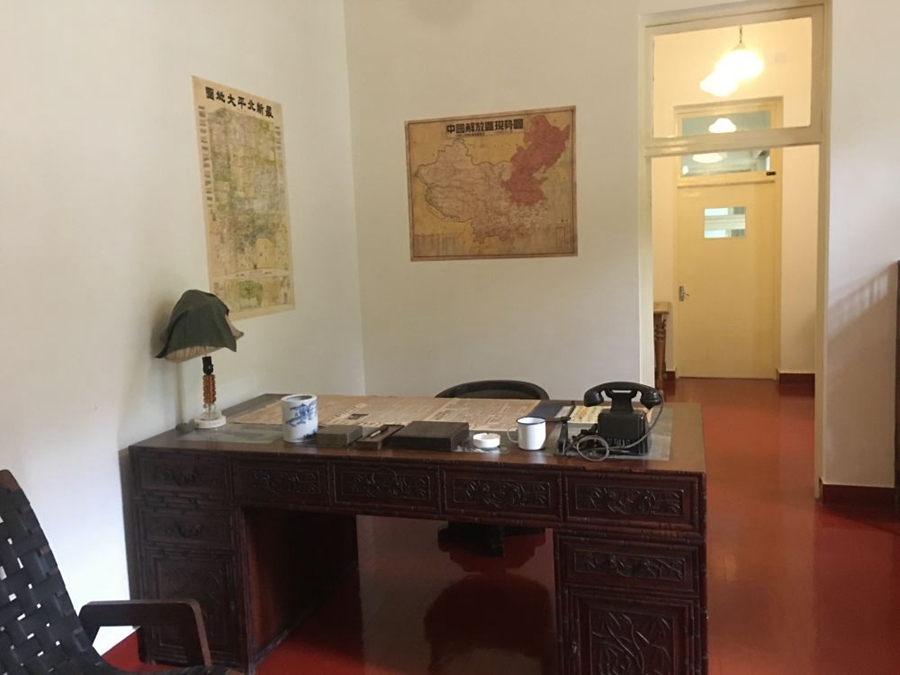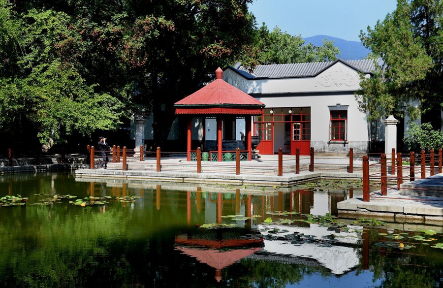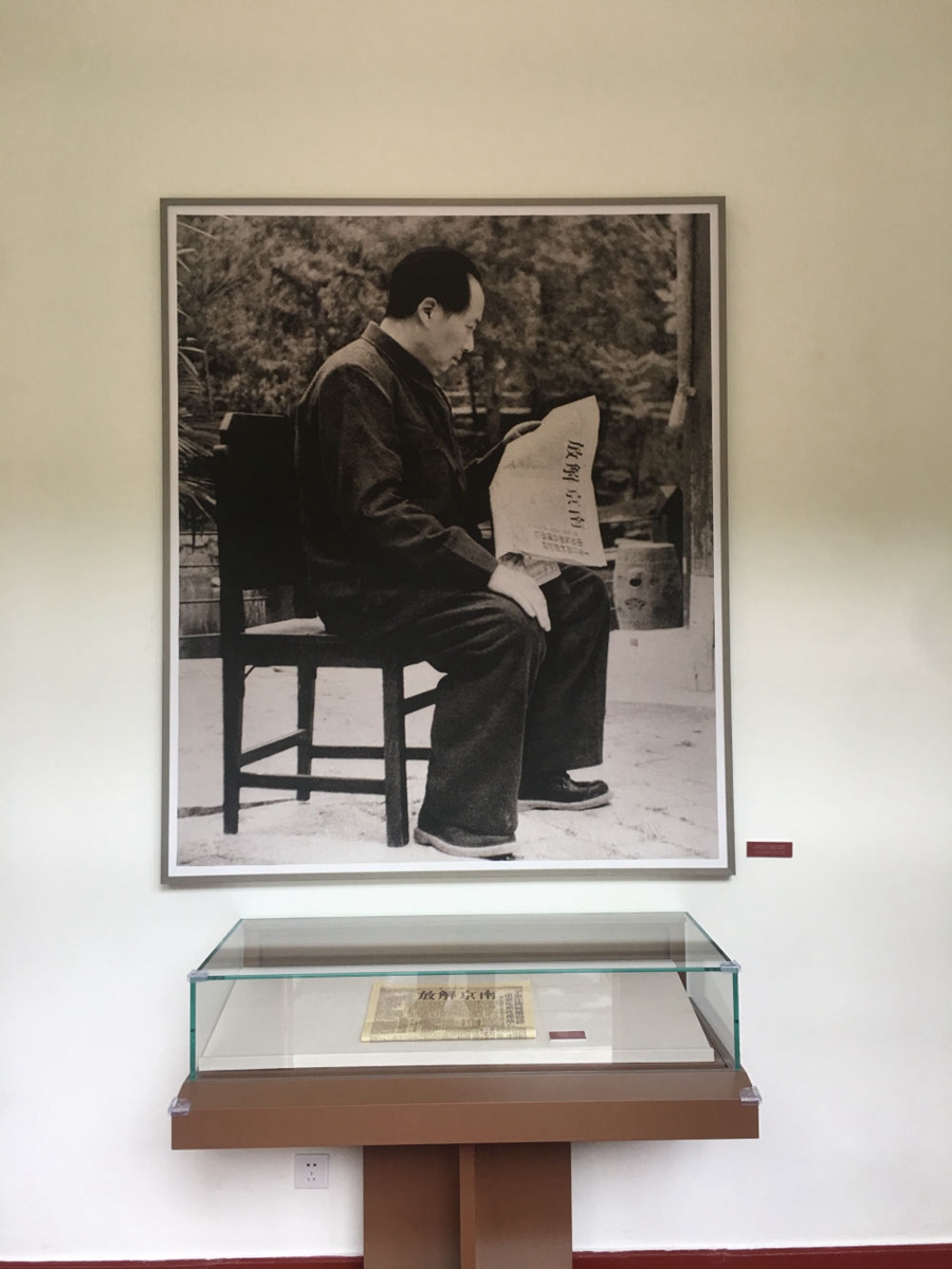 雙清別墅里,簡樸的桌椅家具,墻上的地圖,桌上的紙筆書報,還原著革命勝利前夜,開國領(lǐng)袖在此運籌帷幄、決勝千里的場景;六角紅亭前,當年毛主席坐在木椅上閱讀《進步日報》“南京解放”報道的畫面,如在眼前。