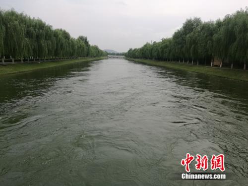 南水進(jìn)京的路線末端,有一段約800米的明渠,在這里可以看到奔流的江水源源不斷涌入。中新網(wǎng) 張尼 攝