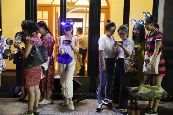 9月9日傍晚,天色尚未完全暗下,從車公莊西或者動(dòng)物園地鐵站下車,你就能匯入一股神奇的人流。年輕女孩居多,提著沒來得及吃的快餐,手里拿著手幅和燈牌,頭上戴著閃光的發(fā)箍,三五成群地向北京展覽館劇場走去。