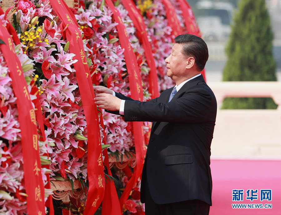 9月30日上午,習(xí)近平、李克強(qiáng)、栗戰(zhàn)書、汪洋、王滬寧、趙樂(lè)際、韓正、王岐山等黨和國(guó)家領(lǐng)導(dǎo)人來(lái)到北京天安門廣場(chǎng),出席烈士紀(jì)念日向人民英雄敬獻(xiàn)花籃儀式。這是習(xí)近平整理花籃上的緞帶。 新華社記者 龐興雷 攝