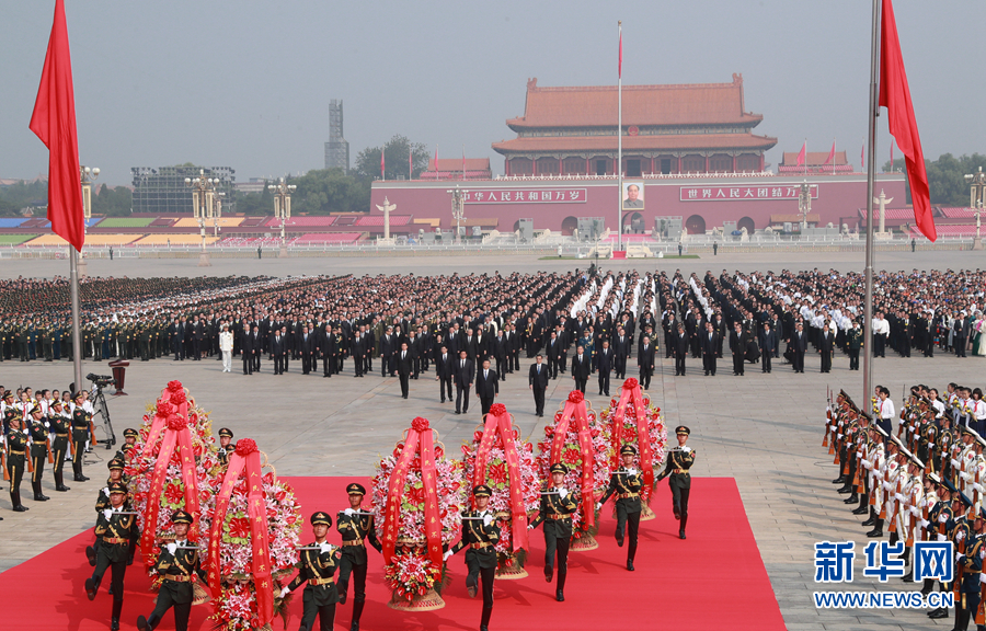 紀(jì)念碑前,4000多名各界代表手持鮮花,列隊(duì)肅立。他們中有年逾九旬的老戰(zhàn)士、老同志,有胸前佩戴著紅飄帶的烈士親屬,有國(guó)家勛章和國(guó)家榮譽(yù)稱號(hào)獲得者代表,有參加全國(guó)民族團(tuán)結(jié)進(jìn)步表彰大會(huì)的代表,有朝氣蓬勃的青年學(xué)生和少年兒童。