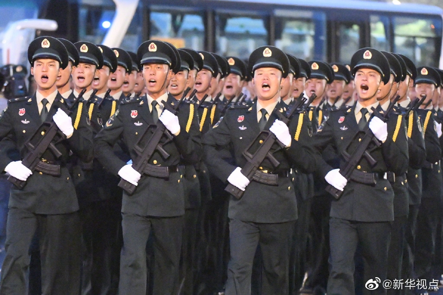 晨曦微露,裝點一新的東長安街上,三軍列陣,鐵甲生輝,參加國慶70周年閱兵的全體受閱官兵集結(jié)完畢,雄姿英發(fā)、精神抖擻。由人民解放軍、武警部隊和民兵預(yù)備役部隊約15000名官兵、580臺(套)裝備組成的15個徒步方隊、32個裝備方隊,沿東長安街綿延向東約2公里;陸、海、空航空兵160余架戰(zhàn)機(jī),組成12個空中梯隊,在北京周邊多個機(jī)場整裝待發(fā)。?